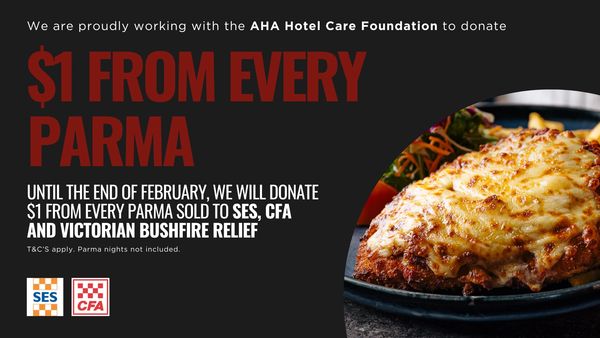 We are proudly working with the AHA Hotel Care Foundation to donate $1 from every parma to the SES, CFA an Victorian Bushfire Relief to support our communities.